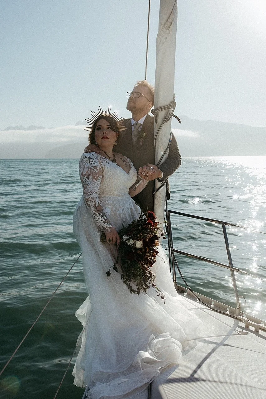 Sailboat elopements get you out onto the water and allow you to explore remote beaches and rocky shores just minutes from Seward, Alaska.